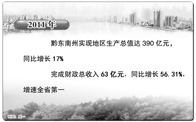 本报讯 记者王新伟、通讯员杨玉平报道:2011年,贵州省黔东南苗族侗族自治州深入贯彻落实科学发展观,突出实施“工业强州、城镇带州、旅游活州”战略,精准布局、奋力赶超,各项工作取得显著进步。数据显示,2011年,黔东南州实现地区生产总值达390亿元,同比增长17%;完成财政总收入63亿元,同比增长56.31%,增速全省第一。