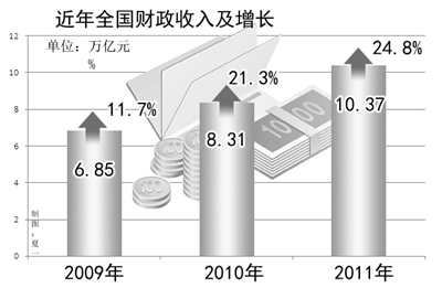 据财政部公共财政收支情况,2011年,全国财政收入103740亿元,增长24.8%。其中,中央本级收入51306亿元,增长20.8%;地方本级收入52434亿元,增长29.1%。数据显示,中国财政收入再次大幅超收,财政收入持续增加,地方财政收入增速快于中央财政收入,非税收入多年低增长过后再次高增长。