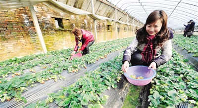 游客在湖北省丹江口市三官殿镇安乐河草莓基地采摘草莓(2月11日摄)。近年来,三官殿镇农民利用邻近城区的优势,大力发展草莓产业,一处七分地的塑料大棚种植草莓,可带来两三万元的收入。 新华社记者 郝同前摄