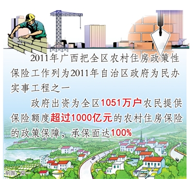 为了避免低温雨雪冰冻、旱灾、洪涝等自然灾害给农村群众的房屋安全带来严重威胁,2011年广西推行农村居民住房政策性统一保险,由政府为1051万农户提供保险额度超过1000亿元的农村住房保险,承保面达100%。据了解,广西是全国第四个、西部地区第一个实现全部农村住房政策性保险的省(区)。
