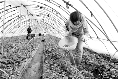 河南省平舆县清河村民郑春梅的草莓大棚。眼下,她种植的6亩反季节大棚草莓到了收获的旺季,“章姬”、“甜宝”等品种的草莓个大红润、清香甜美,引来许多采摘的游客,也吸引了周边县区的客商。据悉,大棚草莓成熟期将持续到五六月份,一亩地能收入四五千元。图为游客在大棚内采摘草莓。 本报记者 王 伟 通讯员 訾现红摄影报道