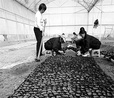 嘉鱼县阴山村的大禾设施农业基地内,农民正加紧制作营养钵,为蔬菜提前育苗做准备。 汪姝琴摄