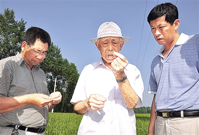 图为徐一戎(中)在察看水稻长势。 (资料图片)