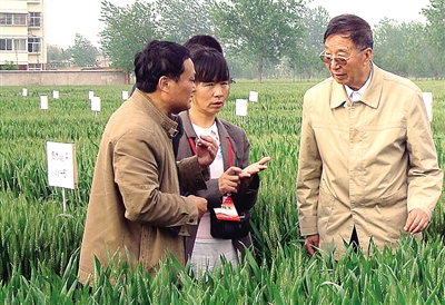 图为李振声(右一)正察看小麦试验田基地。 (资料图片)