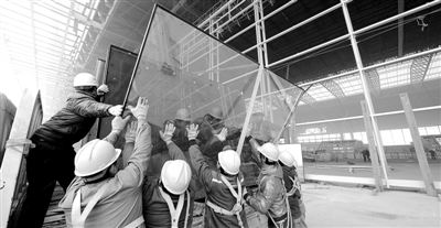 2月14日,几名工人在向京广客专郑州东站候车室内搬运玻璃。由中铁建工集团承建的京广客专郑州东站经过2年多的建设,目前主体工程已基本完工,项目施工进入站房装修和设备安装阶段。 新华社记者 赵 鹏摄