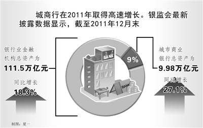 实际情况也是如此。银监会最新披露的数据显示,截至2011年12月末,银行业金融机构总资产同比增长18.3%,其中城商行总资产同比增长27.1%,增速明显高于平均水平,也高于股份制银行和大型商业银行。