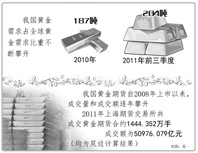 随着人们收入水平提高、黄金关注度提升以及寻找更广泛投资渠道等因素影响,我国黄金需求不断升温。据世界黄金协会统计,2011年前三个季度,我国的黄金投资总需求(主要是金条和金币)达204吨,而2010年全年为187吨。需求的提升也使得我国黄金需求占全球黄金需求比重不断攀升。