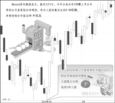 今年年初,产业资本在大盘2132点附近开始连续净增持,大盘随之出现连续5周上涨。据wind资讯数据显示,截至2月9日,今年以来共有120家上市公司得到公司重要股东净增持,净买入股份数共达到3.55亿股,净增持部分市值为29.91亿元。相比之下,同期仅有55家上市公司遭遇净减持2.15亿股,净减持部分市值为23.97亿元。