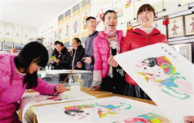 2月17日,四川绵竹市年画村的年画吸引了不少游客驻足。绵竹是传统的年画之乡,如今,绵竹正在打造集年画制作、展示和销售于一体的“民俗文化产业园”,结合乡村旅游、观光农业等打造商务酒店、休闲娱乐设施等相关配套,带动地方经济发展。 本报记者 李树贵摄