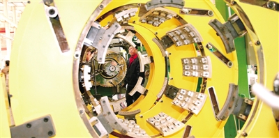位于天津滨海新区的天津赛象科技股份有限公司,是集科研、生产、贸易于一体的高新技术企业,其自主研发的巨型和特巨型子午线轮胎装备的市场占有率位居同行业前列。图为一名员工在检测设备。本报记者 张 欣摄