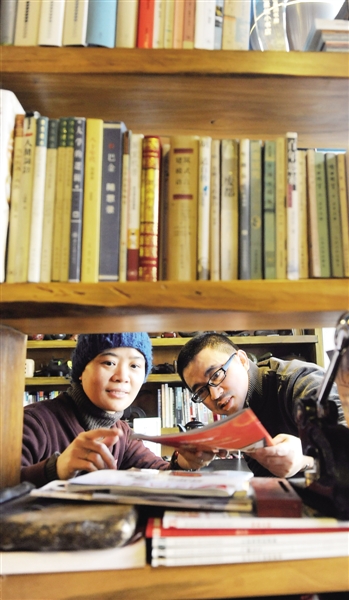朝阳区万科青青家园社区读易洞书房,店主邱小石(右)、阮丛夫妇正在整理上架图书。社区书店以特定的居民生活社区为主要市场和服务对象,发展前景广阔。