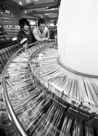 工人在宁夏回族自治区西吉县闽宁工业园区一家工厂的编织袋生产车间内工作。