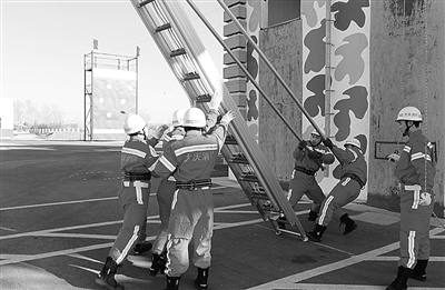 大庆市公安消防支队认真研究全市灭火救援的任务形势,坚持战斗力标准,紧盯实战需要,采取有效措施,扎实推进岗位练兵活动。图为消防官兵正在组织开展15米金属拉梯架设攀登训练。 本报记者 倪伟龄摄