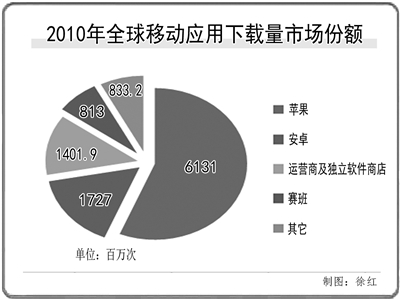 苹果开创的由开发者和平台分成的移动应用商店模式盘活了智能手机行业。通过这个高度集中的销售平台,默默无闻的独立开发者有可能凭借一款优秀程序“一夜成名”,开发出手机游戏《愤怒的小鸟》的芬兰罗维奥游戏公司最初不足10人,但这款游戏下载量已超过2亿次,公司估值超过90亿美元。开发者的热情让应用商店中的程序成几何速度增长,而丰富多彩的应用又直接推动了智能手机终端的普及。按照创新工场董事长兼首席执行官李开复的说法,目前国内已有1700万苹果手机系统用户和3000万安卓系统用户。预计到2013年,全球移动应用商店的下载量将达到216.5亿次,整体市场规模将达到 294.8亿美元。