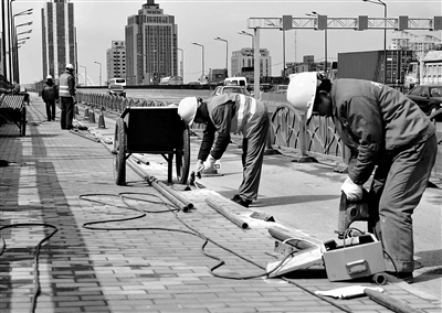 2月26日,施工人员在吴淞大桥上施工。 为确保桥梁安全运行,宝山区建设和交通委员会将实施吴淞大桥抢修加固工程。因施工需要,2012年3月3日至6月2日吴淞大桥西幅桥将进行封闭交通施工,东幅桥实施双向通行;6月3日至7月中旬西幅桥开放交通,中央两根车道进行封闭交通施工。 严大明摄 (新华社发)