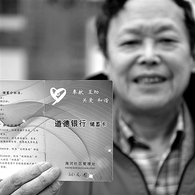 山东省烟台市经济技术开发区海河社区推出“道德银行储蓄”制度。居民参与的好人好事将以道德积分的形式体现在“道德银行储蓄卡”上。当积分达到一定标准后,将优先享受多种优惠待遇。图为社区居民孙志国在展示自己的“道德银行储蓄卡”。 李志勇摄(新华社发)