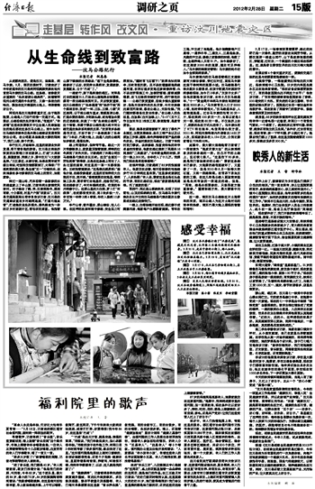 车行汶川,开始堵车,这里的旅游业快速发展,吸引着各地的游客。汶川县正将经济恢复的主要精力放在旅游上,打造“大禹故里、熊猫家园、羌绣之乡、震中汶川”4大旅游品牌。“三江景区、水磨古镇,如果在周末或节假日来玩,吃饭和住宿都要预订,火得很!”干练爽朗的晏大蓉,是全国“五一”巾帼标兵,说起她亲自参与修建的汶马路上的变化,如数家珍。