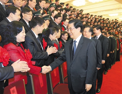 上午9时30分,当胡锦涛等中央领导同志来到人民大会堂北大厅同出席大会的代表们见面时,全场响起了热烈的掌声。胡锦涛等高兴地同代表们亲切握手,并合影留念。