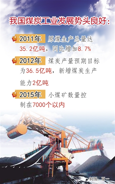 数据显示,2011年,我国亿吨级煤炭企业集团已经达到7家,5000万吨级煤炭企业集团超过10家,内蒙古、山西等主产区的小煤矿已经基本退出市场。我国大型煤炭企业原煤产量达到21.8亿吨,同比增长10.9%,占原煤生产总量的比重达到61.9%,同比提高1.2个百分点。