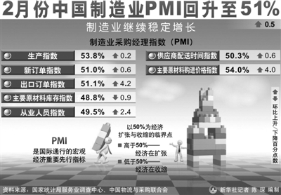 本报北京3月1日讯 记者薛志伟报道:中国物流与采购联合会、国家统计局服务业调查中心今天发布的调查报告显示,2月份中国制造业采购经理指数(PMI)为51.0%,比上月小幅提升0.5个百分点,连续3个月位于50%这个扩张与收缩的临界点以上。去年12月至今年2月,制造业PMI已经连续3个月回升。2月份,新订单指数、采购量指数等主要先导性指数回升更加明显,反映出当前市场需求有所扩张,生产经营活动趋于活跃,制造业经济整体表现稳中趋升。