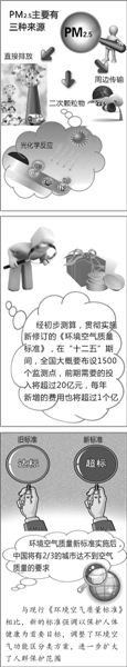 监测只是手段,治理PM2.5才是真正目的。目前,PM2.5主要有3种来源:一是直接排放的一次颗粒物,如工业排放、汽车尾气等;二是通过气态污染物变化而来,比如,二氧化硫、二氧化氮等发生光化学反应后变成硫酸盐和硝酸盐等二次颗粒物;第三种是周边传输。