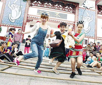 游客在海南省三亚市南山佛教文化苑跳竹竿舞。 陈文武摄