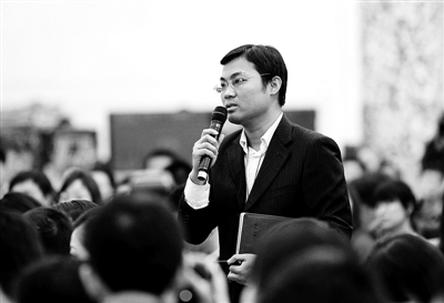3月2日下午,全国政协十一届五次会议在人民大会堂举行新闻发布会。这是本报记者在现场提问。 本报记者 赵 晶摄