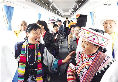 3月1日下午,出席全国政协十一届五次会议的政协委员杨一奔(左、纳西族)和何春(右、拉祜族)在去往驻地的车上交谈,“文化”是两位少数民族政协委员共同关注的话题。 本报记者 赵 晶摄