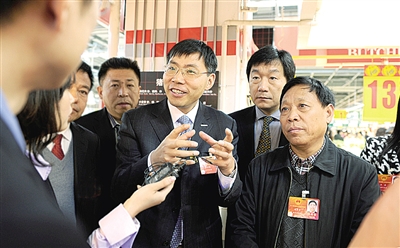 3月3日上午,全国人大代表孙丕恕(中)、周家贵(右一)相约进行市场调研。 本报记者 李景录摄