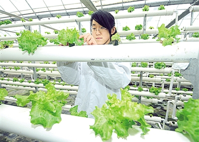 工作人员在位于江苏盐城大丰市的盐土大地农业科技园内观测海水蔬菜生长情况。 沈 鹏摄