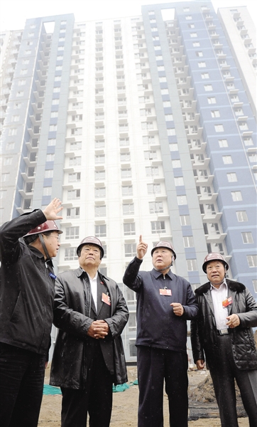全国政协委员高春芳(右一)、冯世良(右二)、金大鹏(左二)来到北京建工集团双合家园项目工地进行调研。 本报记者 赵 晶摄