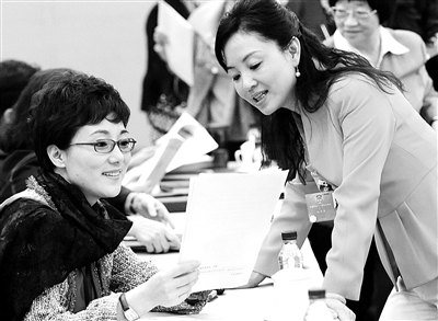 左图 3月6日上午,出席本次政协会议的委员在驻地小组讨论政府工作报告。这是小组讨论会开始前,妇联界杨俊委员(左一)和孙丹萍委员(左二)在交换意见,准备发言。 本报记者 赵 晶摄