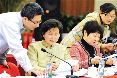 3月8日下午,政协科协界委员讨论刑事诉讼法修正案草案,李兰娟委员(左二)正在仔细核对相关内容,认真准备发言。 本报记者 赵 晶摄
