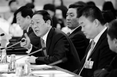 左图 3月7日,人大河南代表团在驻地举行全体会议。刘卫星代表(左二)就金融支持中原经济区建设等话题进行发言。 本报记者 李景录摄