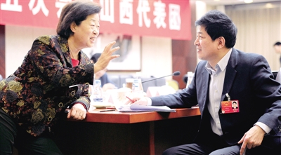 3月9日上午,人大山西代表团分组审议刑事诉讼法修正案草案。会议间隙,马巧珍代表(左)、王茂设代表(右)就修改的条文交换意见,他们认为,这些修改充分体现了以人为本的理念。 本报记者 李景录摄