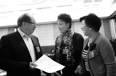 3月10日上午,政协文艺界委员在驻地结合履行职责实践讨论政协工作。会前,王立平委员(左一)、郭瓦加毛吉委员(中)、侯露委员交流进一步推动文化大发展大繁荣的体会。 本报记者 赵 晶摄