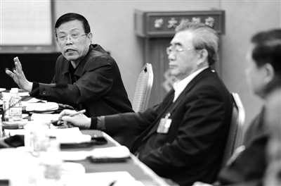 3月12日上午,人大辽宁代表团审议两高报告。张行湘代表(左一)在发言时说,“两高报告的共同特点是总结成绩实事求是,用数据说话。” 本报记者 李景录摄