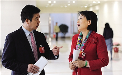 3月12日上午,浙江代表团在驻地审议两高报告。沈明才代表(左)与周晓光代表步入会场前就加强知识产权审判工作边走边议,不由得停下了脚步。 本报记者 李景录摄