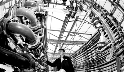 图为在新奥集团煤基能源生产零排放技术系统实验中心微藻养植暖房,工人在检测微藻养植光照强度。