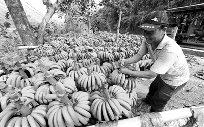 3月9日,村民周文富正把香蕉放到路边等待客商收购,他家种植了4000多棵香蕉,收入能达10万余元。 云南省红河哈尼族彝族自治州屏边县的白河桥乡是香蕉、菠萝等热带经济作物的产地,适逢收获季节,白河桥乡大约6万亩香蕉迎来丰收,特色产业带动了当地群众致富。 新华社记者 秦晴 摄