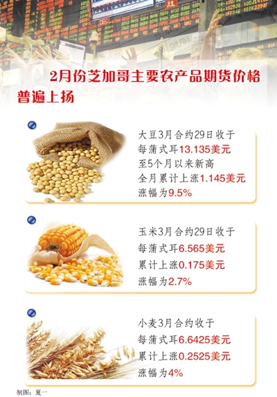 2月份芝加哥主要农产品期货价格普遍上扬。其中,大豆期价一路攀升,3月合约2月29日收于每蒲式耳13.135美元,至5个月以来新高,全月累计上涨1.145美元,涨幅为9.5%。玉米、小麦期价先抑后扬,涨势明显。玉米3月合约29日收于每蒲式耳6.565美元,累计上涨0.175美元,涨幅为2.7%。小麦3月合约收于每蒲式耳6.6425美元,累计上涨0.2525美元,涨幅为4%。