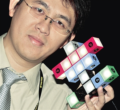 3月13日,宣传低碳环保、节能减排理念的照明科技展在台湾台北世贸中心开幕。图为工作人员展示可自行组合的创意照明产品。 新华社发