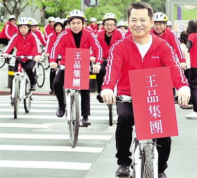 3月6日,王品集团董事长戴胜益(前)率领公司员工骑自行车到台湾证券交易所主持挂牌上市典礼。2012年,王品集团在两岸预计开设新店70余家,将积极扩展大陆市场。 新华社发