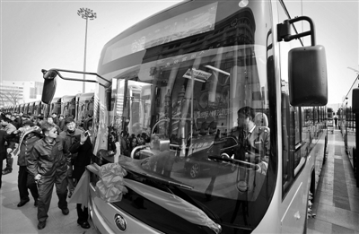3月15日,天津即将投入运营的新公交车亮相,吸引众多市民参观。首批500辆12米长新型公交车将服役于全市14条骨干线路。据悉,作为天津今年的20项民心工程之一,该市将更新、新增公交车2000辆。 游思行摄(新华社发)