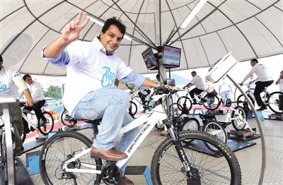3月中旬,在巴西里约热内卢的科帕卡巴纳海滩,人们在里约热内卢科帕卡巴纳海滩骑自行车发电,驱动巨型自行车雕塑“运转”。日前,一座巨型自行车雕塑亮相科帕卡巴纳海滩,展示这座雕塑是即将在里约举行的“世界骑车游”活动的一部分,旨在宣传绿色出行的环保理念。 新华社发