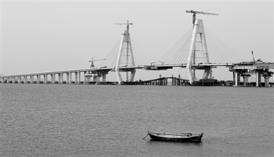 这是3月22日拍摄的即将合龙的山东海即跨海大桥。连接山东烟台海阳市与青岛即墨市的海即跨海大桥主体工程即将建成合龙,预计今年5月份正式通车。 梁孝鹏摄(新华社发)