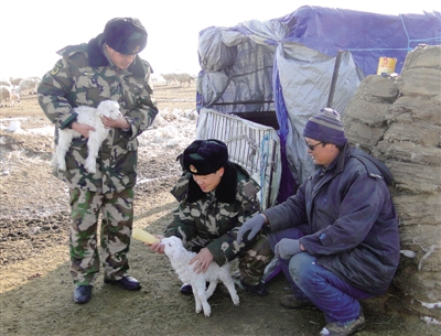 3月21日,内蒙古锡林郭勒盟公安边防支队那仁宝力格边防派出所民警帮牧民贾孟刚喂羊羔。目前,内蒙古锡林郭勒草原已迎来接羔期,受前段时间降雪降温影响,北部边境地区许多牧民家中牧业生产人手不够,给接羔保畜工作带来困难。根据这一情况,当地公安边防部队组织广大干警组成“党员先锋服务队”深入牧户,帮助牧民解决困难。 新华社记者 邹俭朴摄
