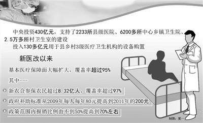“医改是先从基层开始,让基层百姓、社会弱势群体优先享受到医改成果的。”长期研究医改的华中科技大学同济医学院教授姚岚说。按照“保基本、强基层、建机制”的改革路径安排,新医改启动以来,中央投资430亿元,支持了2233所县级医院、6200多所中心乡镇卫生院、2.5万多所村卫生室的建设,投入130多亿元用于县乡村3级医疗卫生机构的设备购置,建设范围和资金投入规模之大前所未有。