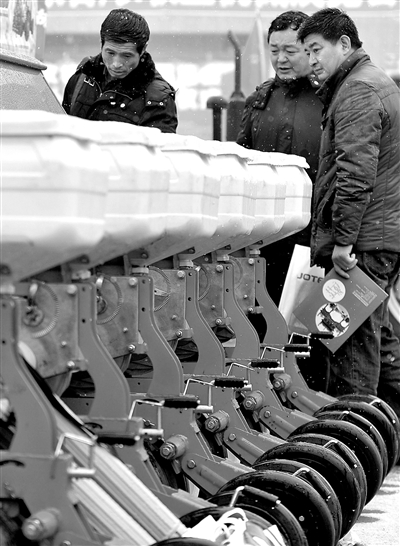 3月21日,参观者在观看玉米免耕精密播种机。当日,由内蒙古农牧业机械技术推广站和农牧业机械行业协会等部门联合主办的第四届内蒙古农牧业机械展览会,在呼和浩特市国际会展中心举行,此次展览为期3天,吸引了山东五征、中国一拖、福田雷沃等近200家国内知名农牧业机械生产企业参展。 新华社记者 任军川摄