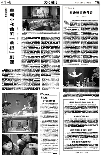 台上唱古道今,台下风雨人生。袁新中说,他有一个心愿,希望国家和政府能对民间剧团有更多的扶持和资助,让民间文艺进一步兴盛起来。他希望自己的剧团逐步走向正规,更好地为基层百姓服务,把传统的民间文艺发扬光大,让成长于淮河流域的这朵奇葩绽放得更加璀璨夺目。他也深信,他的“草根”剧团也将会迎来民间文艺大发展的春天。